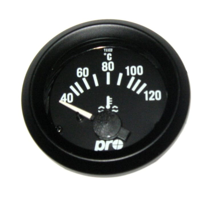 Universal electric water temperature gauge for automotive uses. Made of high quality ABS material and built to precision. Features a highly visible scale against a black dial face and a red needle with night illumination.