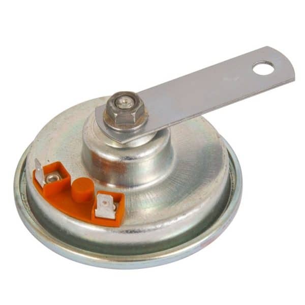 Electromagnetic horn {low pitch} with two male spade terminals. White zinc plated, compact design. Recommended to be installed with the matching high pitch horn