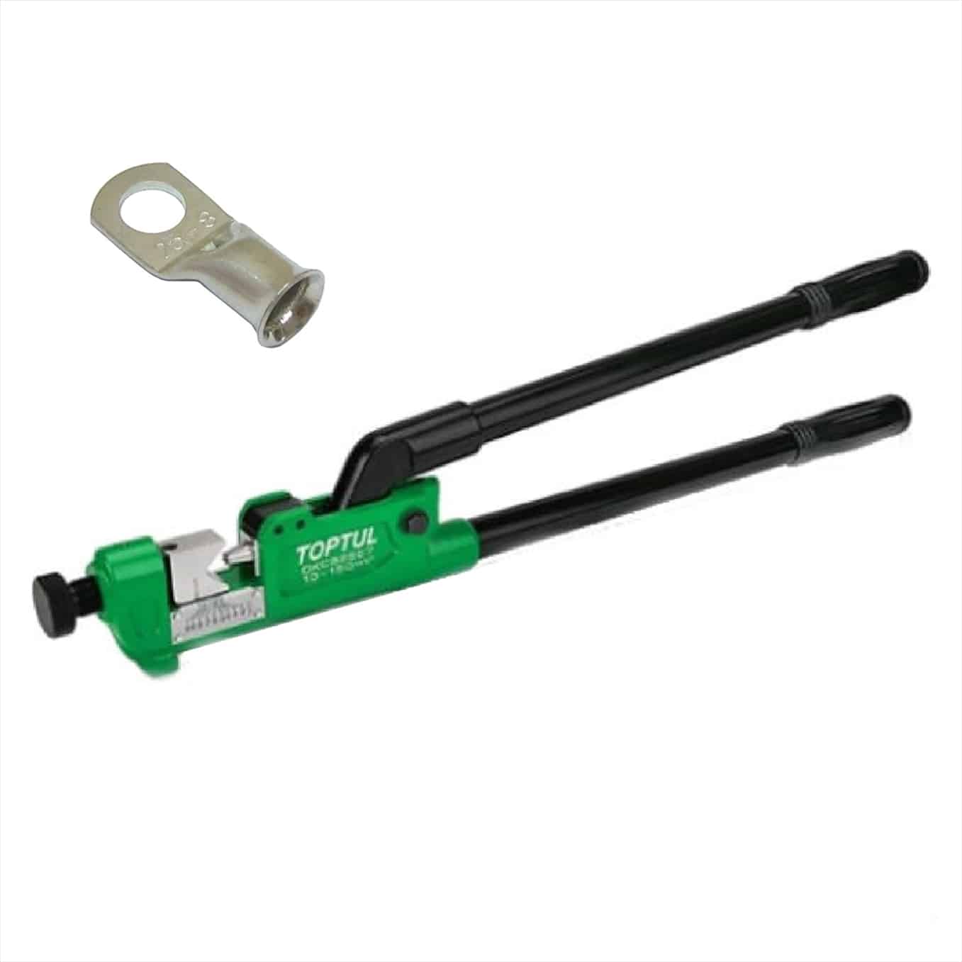 This TOPTUL brand cable lugs crimping tool features V-jaw that hold terminals in place and prevents slipping. Crimp size is easily adjusted by using screw adjustment (with clearly marked gauge on the side). The tubular handle design reduces weight, and the optimum lever action reduces required effort.