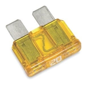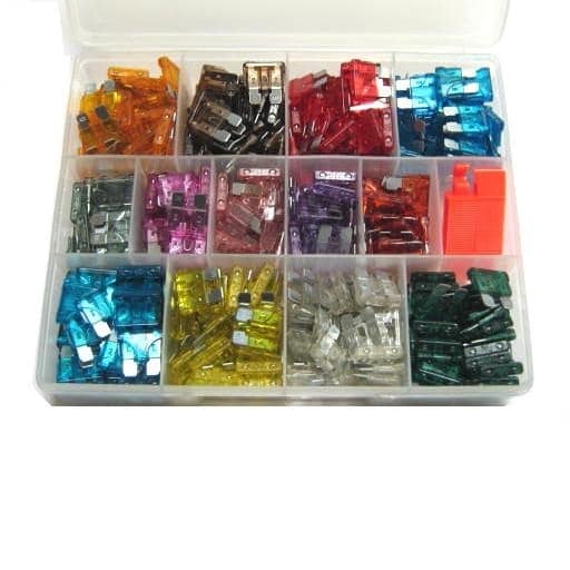 Assortment of automotive standard blade fuses in handy plastic storage case including two fuse pullers