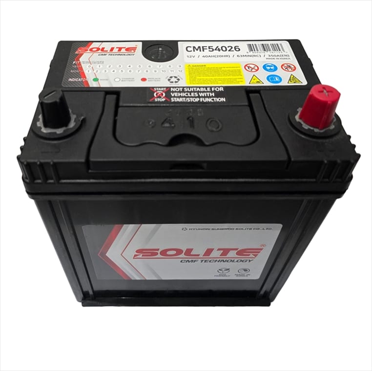 STARTER brand high-performance CMF battery made by Solite Korea. The hyper–resistant PE separator provides long-lasting performance with good cranking even in extremely cold conditions. Features microporous flame arrestor filter attached to the cover exhaust, blocking any leakage of electrolyte, thereby preventing rupture as well as the corrosion of the automobile body and environmental pollution. The fitted self-inspection Magic-Eye indicator enables the user to monitor the condition and usability of the product throughout its lifespan.